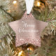 Extravagante Kalligraphie Frohe Weihnachtsstern Form Acrylschmuck. Girly Imitate funkelnd Rose Gold Glitzer oben und unten Rand über einem Imitat Rose Gold und rot gebürstete Metall Stil Ober-Folie. Die Farbe der altmodischen Textgrafik kann geändert werden. Sie können die Typografie löschen und ein schönes, modernes Kalligraphieskript aus dem System verwenden, um Ihr eigenes personalisiertes Ornament zu erstellen.