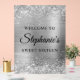 Erstellen Sie Ihre eigene 16. Geburtstagsparty Begrüßung 18x24 vertikales Acrylzeichen für Ihre Tochter. Ersetzen Sie das Beispielbild durch Ihr eigenes Foto. Passen Sie die moderne und elegante Kalligrafie mit einem modernen Schriftart im All-Caps-Stil an, um Ihr eigenes personalisiertes Zeichen zu schaffen. Im Hintergrund befindet sich ein Imitat funkelnd silberner Glitzer mit einem silbergrauen, gebürsteten Metall ombre Folie Digital Art Grafik. Der Glitzer, funkelnd und metallisch glänzt mit digitalen Grafiken, die wie ein Foto auf Ihrem Schild drucken.