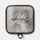 Erstellen Sie Ihre eigenen personalisierten Quadrat-Pothalter für Monogramm. Girly Imitate funkelnd silberner Glitzer auf einem Imitat silbergraue metallische Stilfolie. Passen Sie die Stile des Schriftartes an, um Ihr eigenes Design für ihre besondere Feier zu kreieren.