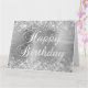 Große horizontale Imitate funkelnd silberne Glitzer auf der Oberseite und unten Rand über einem Imitat silbergrau gebürstete Metall-Stil Ober-Folie digitale Kunst Grafik. Die Farbe der Happy Birthday Textgrafik kann geändert werden. Die Hauptfarben sind grau, silber, schwarz und weiß. Behalte oder löscht die innere Textnachricht und Signatur.