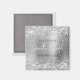 Erstellen Sie Ihren eigenen Magneten aus Save the Date Foto mit Braut und Bräutigam Name und Hochzeitstermin. Der Hintergrund zeichnet sich durch einen künstlerisch silbernen Glitzer und silbergraue metallische Ober-Folie aus, die wie ein Foto gedruckt wird. Passen Sie die Größe des Schriftartes an, wie es für längere oder kürzere Namen erforderlich ist.