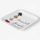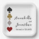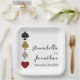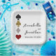 Diese benutzerdefinierten Teller haben ein Las Vegas Casino Thema. Die vier Anzüge in einem Kartenspiel werden auf dem verlassen in einem horizontalen Muster gedruckt. Die Pik ist ein Schwarz-Glitzer-Design, der Club ist Gold, der Diamant ist Silber, und die Herzen ist ein rotes Glitzer-Design. Die Namen des Ehepaares und das Beispiel des Hochzeitstages sind rechts in einem eleganten schwarzen Schriftart gedruckt.