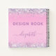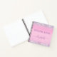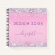 mit Monogramm gürtelndes Sketch-Notebook mit funkelnd holografischen lila und silbernen Imitaten Glitzer Konfetti oben und unten vor einem rosa Hintergrund. Fügen Sie einen Notizbuch-Titel, Ihren Monogramm-Initial und Ihren Namen in einem trendigen lila Skript mit Swashes hinzu.