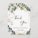 Eine Dankeschön-Karte für einen 50. Geburtstag (oder jedes Alter). Ein schick weißer Hintergrund mit Eukalyptusgrün und Imitaten goldenen Glitzer Staub. Vor dem großen schwarz gefärbten handgeschriebenen Skript und den Text: Danke, Ihr Text, Titel und ein Datum. Zurück: Personalisieren Sie Ihre Dankeschön Notiz und Name.