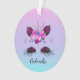 Einhörner sind zauberhaft und Weihnachten auch! Holen Sie sich dieses unvergessliche Sake-Ornament für diese besondere Person in Ihrem Leben. Es hat eine Kontur eines einsamen Gesichts mit Wimpern. Es ist Set auf einem farbigen Hintergrund. Personalisieren Sie mit einem Namen.