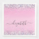 Hübsche, glamouröse und mädchenhaft mit Monogramm Servietten für ihre Geburtstagsparty oder andere besondere Anlässe mit funkelnd holografischen lila, rosa und silbernen Imitaten Glitzer Confetti oben und unten auf einem rosa Hintergrund und ihren Namen in einem weichen grauen trendigen Drehbuch mit Wimpern.