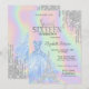 Elegantes blaues Kleid, Eiffelturm und silberne Glitzer-Tropfen auf holografischem Hintergrund.
