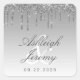 Diese Hochzeitsaufkleber verfügen über eine glänzende silberne Imitat Glitzer Tropfen Oberkante auf einem silberfarbenen Hintergrund. Personalisieren Sie sie mit den Namen der Braut und Bräutigam in elegantem dunkelgrauen Skript überlagert auf einem weißen Ampersandsymbol, mit dem Hochzeitstermin unten in dunkelgrauen Sans Serif Schriftart.