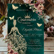 Goldglitzer-Tiara, Kleid, Schmetterlinge und Blumen auf grünem Hintergrund. Laden Sie Ihre Gäste ein, diesen Meilenstein mit einem Design zu feiern, das die Magie und Freude Ihrer Quinceañera widerspiegelt.