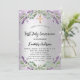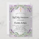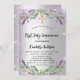 Eine moderne, stilvolle und glamouröse Einladung für eine Erste Heilige Kommunion. Ein silbernes Imitat mit violettem Imitat Glitzer, Glitzern, Lavendelblumen, Blume und Eukalyptusgrün. Der Name ist mit einem modernen handgeschriebenen Stilskript geschrieben. Personalisieren Sie Ihre Daten und fügen Sie sie hinzu.