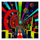 A.I. schuf die psychedelische geometrische, surreale abstrakte Komposition von Globen, Crescents, Würfeln, Planeten, Orben, Kugeln und Wirbel unterschiedlicher Formen und Farben in einer Anordnung, die die Sinne des Künstlers zufrieden stellte.