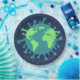 Dieses Design zeigt ein Bild eines grünen Virus in der Form des Planeten Erde, das die globale Reichweite von pandemischen Infektionen symbolisieren soll, wie sie durch COVID-19 verursacht werden, gefährliche Grippestämme oder andere Organismen (wie Viren, Pilze und Bakterien), die die menschliche Gesundheit schädigen können.