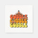 Helles und farbenfrohes Erntedank-Design mit "Gobble Gobble Gobble" in Retro-Typografie und Farben, mit dem Truthahn, der aus dem Text herauskommt.