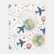 Lebendige nahtlose Musterdecke mit Flugzeugen, Globussen, Flugrouten, Sternen und reiseinspirierten Symbolen in einem spielerischen Luftfahrtstil. Ideal für Reisende, Luftfahrt-Enthusiasten, Vielflieger und alle, die globale Abenteuer-Ästhetik lieben.