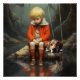 Ein kleiner Junge in einer roten Jacke sitzt auf einem Felsen von einem ruhigen, reflektierenden Wasserkörper, begleitet von seinem Hund. Der Junge scheint traurig und sein treuer Gefährte beklagt ihn. Die Szene ist Set in einem mystischen Wald mit einem ruhigen Ambiente. Digitale Kunstfotografie CS5