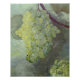 Das Bild zeigt eine Reihe von Trauben in Gelb- und Grüntönen, die an einer Rebsorte hängen. Die Trauben erscheinen plump und durchsichtig, was ihr frisches, saftiges Aussehen verstärkt. Die Blätter, die den Cluster umgeben, sind ein lebendiges Grün, mit empfindlichen Venen sichtbar, die der Szene eine Tiefe verleihen. Der Hintergrund ist sanft verschwommen, der Fokus wird auf die Trauben gelenkt und dem Bild ein Gefühl von Ruhe und Reife vermittelt, als wäre es ein warmer Spätsommertag. Die Farben sind weich, natürlich, und ein Gefühl von Überfluss.