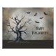 Ein unheimlicher Baum steht vor dem Hintergrund eines riesigen Mondes. Ein schwarzer Rabe sitzt in seinen Zweigen und mehrere Fledermäuse fliegen in der Luft. Das "glückliche Halloween" kann auf Wunsch geändert oder gelöscht werden.