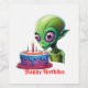 Das ist ein lustiges Bild eines Geburtstagsfeiers der Om Alien, komplett mit einem Kuchen und Kerzen.