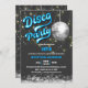 © Socialite Designs Inc. & LICENSORS. Feiern Sie eine Disco Geburtstagsparty und laden Sie die Gäste mit dieser lustigen Retro-Disco-Geburtstagsfeier ein. Die Farben sind silber, weiß, neonblau und grau. Das Design umfasst eine silberne Diskokugel und Gold / Weiß-Saitenleuchten als Hintergrund.