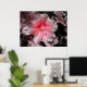 Ein Foto einer weichen rosa Azalea, die Blütenblätter mit Regentropfen nach einem Frühlingssturm bestreut und durch selektive Färbung verstärkt.