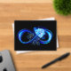 Luminous infinity symbol with glowing, beautiful, lushly blooming rose made of blue flames on black background.
