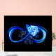 Luminous infinity symbol with glowing, beautiful, lushly blooming rose made of blue flames on black background.