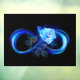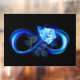 Luminous infinity symbol with glowing, beautiful, lushly blooming rose made of blue flames on black background.