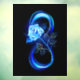 Luminous infinity symbol with glowing, beautiful, lushly blooming rose made of blue flames on black background.