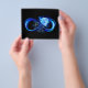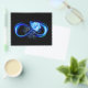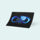 Luminous infinity symbol with glowing, beautiful, lushly blooming rose made of blue flames on black background.