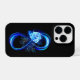 Luminous infinity symbol with glowing, beautiful, lushly blooming rose made of blue flames on black background.