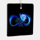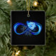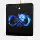 Luminous infinity symbol with glowing, beautiful, lushly blooming rose made of blue flames on black background.