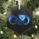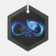 Luminous infinity symbol with glowing, beautiful, lushly blooming rose made of blue flames on black background.