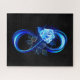 Luminous infinity symbol with glowing, beautiful, lushly blooming rose made of blue flames on black background.