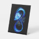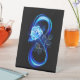 Luminous infinity symbol with glowing, beautiful, lushly blooming rose made of blue flames on black background.