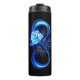 Luminous infinity symbol with glowing, beautiful, lushly blooming rose made of blue flames on black background.