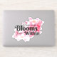 Dies ist ein schöner inspirierender Aufkleber, mit dem man verschiedene Dinge dekorieren kann. Das Design ist von rosa Blüten mit dem Zitat "Glückliche Blüten von innen" über sie.