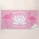 Ein Silhouette Bild einer Lotus-Blume, weißer Text Glück über dem Lotus, und Gute Vibes unter der Pflanze in der Mitte des Produktes, zwei Silhouetten Bilder von dunkelrosa Flamingo-Vögel auf die links und auf der rechten Seite der Blüte, rosa Hintergrund. Einmaliges, schönes, individualisierbares Strandtuch. Sie können Bilder ändern und die Vorlagentexte ändern oder löschen. Viel Spaß und glücklich sein!
