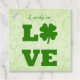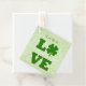Set von 12 quadratischen Gefälligkeitstags mit einem Bild des Satzes "Glück in Liebe" in grüner Schrift und großen grünen Blockbuchstaben, und einem grünen vierblättriges Kleeblatt auf einem Hintergrund von whimsical Weinreben und Herz auf hellgrün. Der Rücken hat das Bild von Knorpelweinen und Herz auf hellgrünen und anpassbaren Text. Sehen Sie sich die gesamte St. Patrick’s Day Favor & Gift Tag Kollektion im Bereich GASTGESCHENKE an.