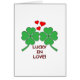 Glück in der Liebe. Zeichnungen von vierblättrigen Kleeblatten mit über ihnen schwebenden Herzformen.