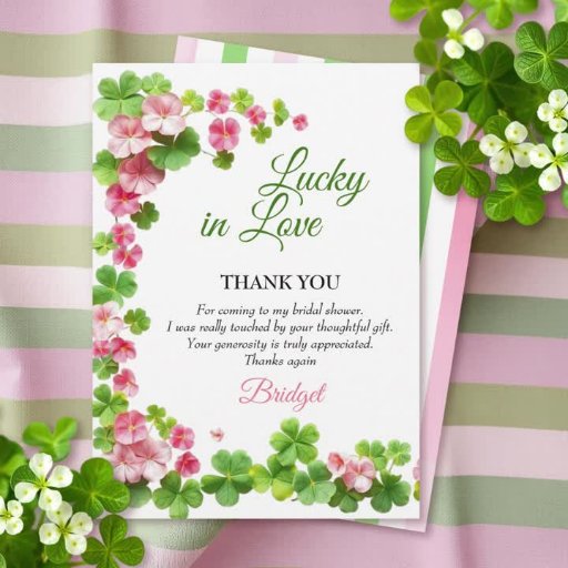 Glück in der Liebe St. Patrick's Day Brautparty Dankeschön Sie Card mit einer modernen Farbe Drehung. An der links Seite, am Boden und an den oberen Rändern ist eine reizvolle Grenze von grünen und rosa Kleeblatten angeordnet, die ein festliches und elegantes Rahmen für Ihre Wertschätzung schafft. Um die fröhliche Stimmung weiter zu steigern, zeichnet sich die Rückseite der Karte durch ein fröhliches Muster aus grünen, rosa und weißen Streifen aus, die eine Touch von Laune und Freude hinzufügen.
