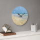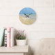 Trendy Strandhaus Wanduhr mit schöner Küstenfotografie mit einem hübschen Sandpiper stehend am Ufer der Ozeanwellen an einem sonnigen Sommertag. Niedliches Strandhaus-Dekor für eine moderne Zuhause mit Meereskunst.Diese herrliche Uferuhr besticht durch eine prächtige Typografie und coole weiße Zahlen für die perfekte Sommerzeit.