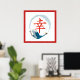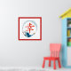 Farbenfrohe Illustration zeigt das japanische Kalligrafiezentrum "Happiness" mit blauem Krankranich, weißem Hintergrund und rotem Rand.