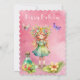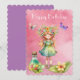 Ein niedliches, hübsches kleines blondes Märchen mit einem phantastischen, grünlichen Kleid und einem Kranz auf dem Kopf der Blume, umgeben von zwei wunderschönen Schmetterlingen, einer in Purpel- und einer in Rosa- und Grüntönen. Unten steht eine Tränenflasche und eine gelbe Blume mit grünem Blattwerk. Auf der Rückseite ein Bouquet mit einer lila Hydrangea