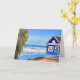 Denken Sie an einen Freund, senden Sie fröhliche Gedanken ihren Weg Karte. Hübsche blaue Strand Hütte Urlaub Zuhause auf dem blauen Ozean tropische ai generierte Kunst.