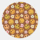 Das ist niedlich orange und gelb und lächelt fröhliche Gesichter mit Retro-Blume auf dunkelbraunem Hintergrund.