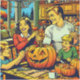 Eine niedliche Halloween- und Herbstkarte. Ein Comic-Buchszenario mit einer familiären Kürbisschnitzerei am Tisch.