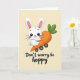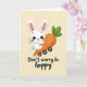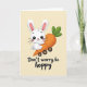 Diese Karte zeigt einen hellgelben Hintergrund mit einem stilisierten weißen Kaninchen, das in der Szene zentriert ist, dessen rundes Gesicht nach vorne gerichtet ist, mit großen schwarzen Augen, einer winzigen roten Nase und innen rosa eingefassten Ohren. Das Kaninchen umarmt eine übergroße orange Karotte wie einen engen Freund, seine Arme sind in einem engen Griff um sie geschlungen, der als liebevoll und ein bisschen schlüpfrig rüberkommt 🐰. Die Karotte ist als eine skurrile kleine Karussellfahrt mit vier dunklen runden Rädern gezeichnet, was der Szene ein sanftes Gefühl von Bewegung verleiht. Sanfte Schattierungen und milde Farbverläufe fügen Tiefe um die Wangen des Kaninchens, die Kurven der Karotte und die Räder hinzu und halten den Look glatt und gemütlich. Ein kurzer Wortspiel-Satz sitzt unter der Illustration in dunkler Schrift, tief und zentriert platziert, sodass das Bild im Mittelpunkt bleibt. Warme Creme-Töne mischen sich mit