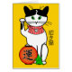 Diese Karte zeigt eine japanische glückliche Katze, die im Geld zuwinkt. Sie trägt die traditionelle Glocke und roter Schellfisch und an ihren Füßen sind eine festliche Laterne mit dem Charakter für "Glück" und ein Papierkran, der Frieden darstellt. Rechts lasen Charaktere "maneki neko" ("Katze zuwinkend ").
