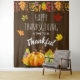 Ein Wandteppich mit dem Text: Glückwunsch Thanksgiving eine Zeit, um dankbar zu sein (kann bearbeitet werden/ geändert werden zu etwas anderem). Entworfen mit einer Aquarellbild von Kürbissen, Eicheln, Pilzen und saisonalen Herbstblättern. An der Spitze eine Grenze, die aus Herbstblättern, Beeren, Eicheln und anderem Blattwerk besteht. Dunkelbrauner Hintergrund. Eichen, Elm und Ahorn Blätter, die um die Typografie fallen.