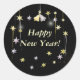 Glückliche Neujahrsstars und Glocken auf schwarz Runder Aufkleber